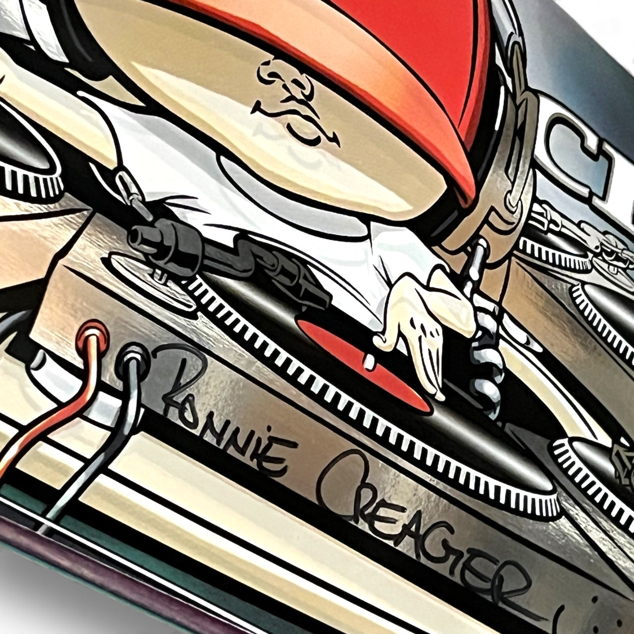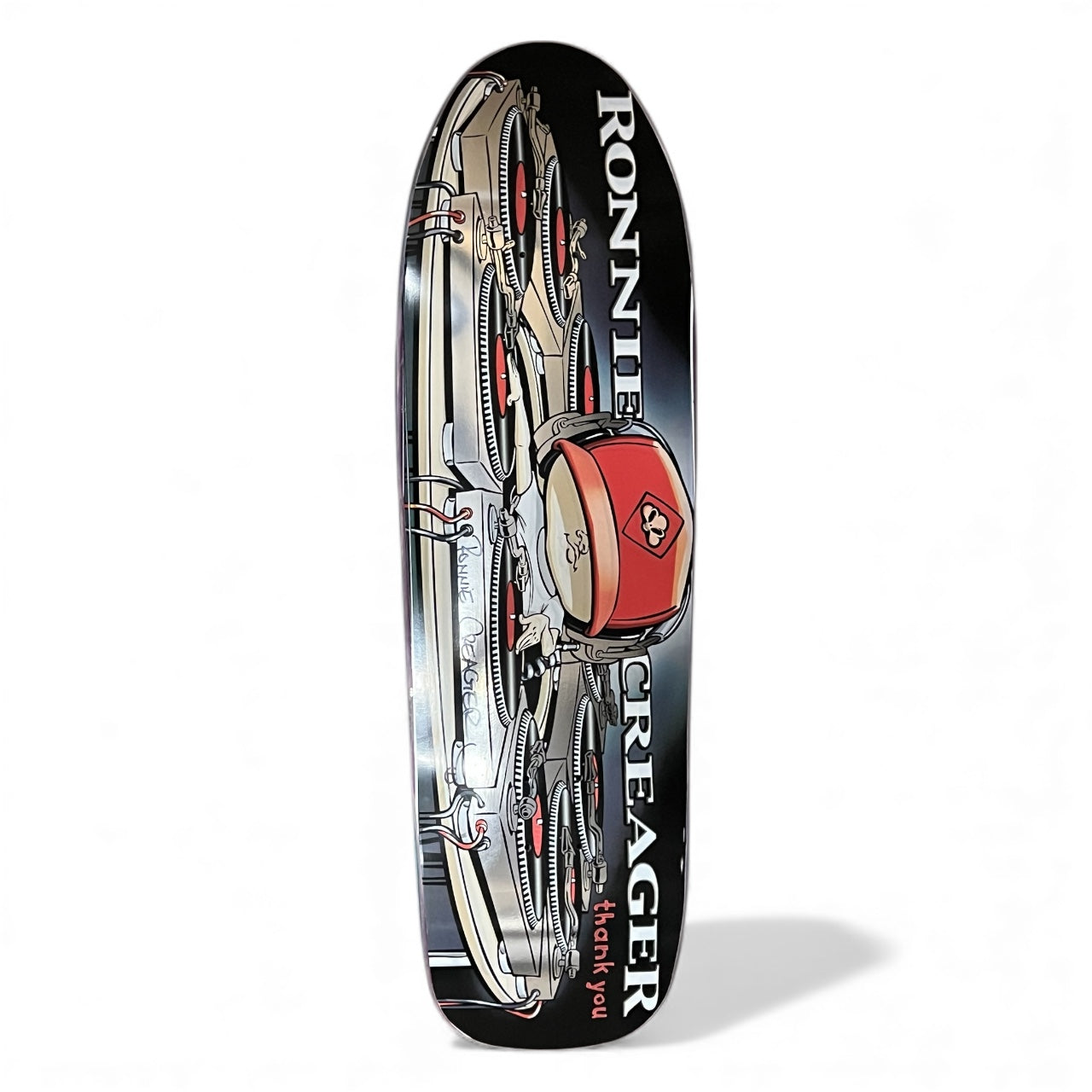 Thank You Skateboards presents the iconic "Mixmaster" graphic, a visual masterpiece originally released by Blind Skateboards, now in a mixed and remastered platinum version. This deck became a symbol of Ronnie's enduring impact on skateboarding.